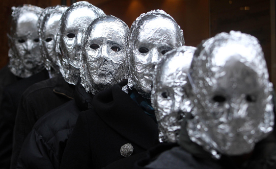Miembros de Amnistía Internacional enmascarados con papel de plata participan en una protesta en Londres contra la explotación laboral de los trabajadores de una refinería de aluminio en Orissa, La India.